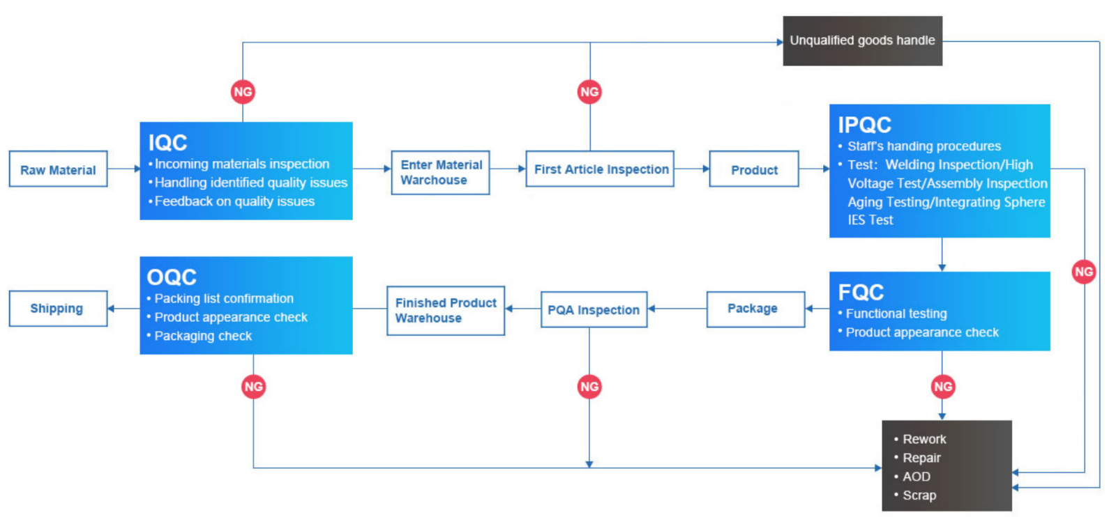 At our facility, we implement a rigorous, multi-tiered quality assurance system aligned with international standards (e.g., ISO 9001, EN/IEC 60598) to ensure superior performance and reliability of all lighting products. Our process includes as flow chart.